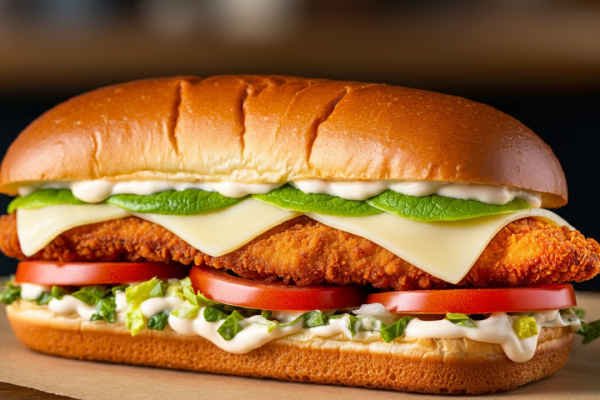 Chicken cutlet, Pepper jack cheese, jalapeno, chipotle mayo with lettuce, and tomato.