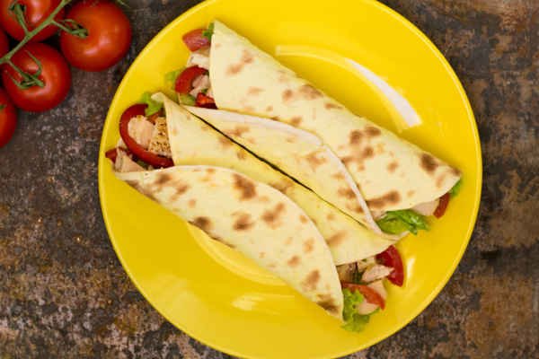 Grilled strips of chicken, romaine lettuce, parmesan cheese and caesar dressing on a flour tortilla.